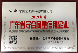 近日,經(jīng)東莞市市場監(jiān)督管理局審核批準,東莞巨正源科技有限公司獲得2019年度“廣東省守合同重信用企業(yè)”榮譽稱號。