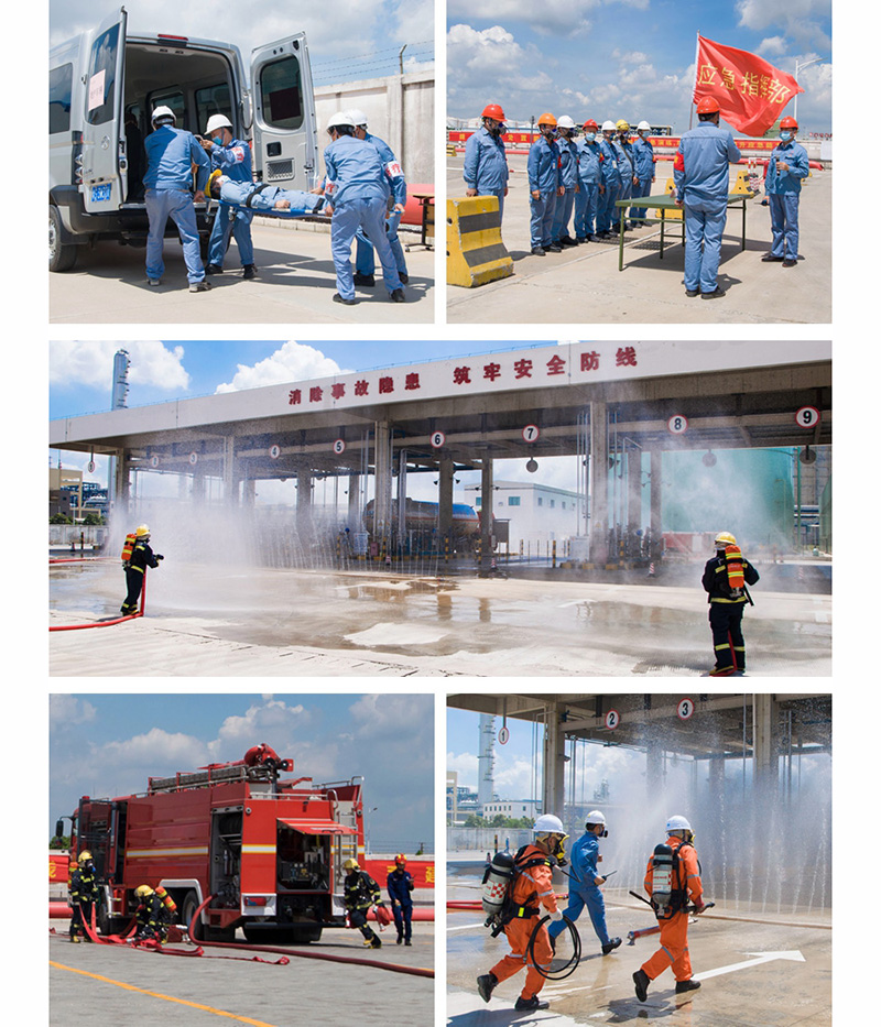 上午10:00,沙田鎮委副書記袁樹堅宣布演練正式開始。此次演練現場模擬移動式壓力容器在裝卸臺進行丙烷充裝時發生大量泄漏,一名充裝員工凍傷,因泄漏量大無法靠近,其他員工立即將受傷員工轉移至安全區域,并先后啟動裝置級、公司級事故應急救援預案,公司領導接報后立即趕往事故現場,成立現場指揮部,生產處置組、疏散組、警戒組、救援組、消防組、后勤組、工程搶險組等按照各自的應急處置職責迅速開展救援工作。